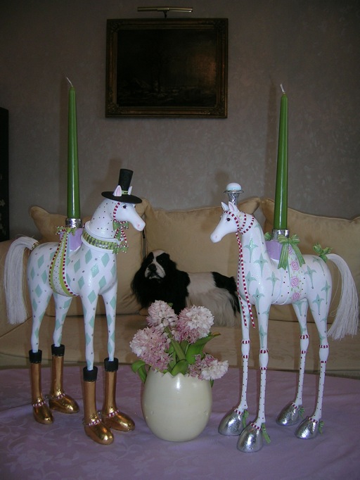 Krinkles Stute Annabelle 44 cm + Hengst Arthur 47 cm Pferde als Kerzenleuchter aus Resin. Farbe weiss, flieder, grün, teils Blatt vergoldet bzw. silbern. Diese Krinkles Pferde sind 44/47 cm hoch und für normale Tafelkerzen geeignet. Der Schweif der Pferde ist aus Hanf. Für Pferde und Krinkles Liebhaber ein wundervolles Dekorationsstück. Arthur der Krinkles Hengst trägt Blatt vergoldete Reit Stiefel und hat auf dem Haupt einen schwarzen Zylinder. Seine Frau Stute Annabelle hat einen silberne Krone und silberne Schuhe. Die Schweife sind aus Hanf.