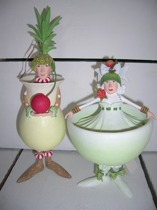 Aus den USA handgemachte Krinkles von der Kinderbuchillustratorin Patience Brewster. Hier die Figuren Marguerita Magarita und Peter Colada Ornament. Stück je 75,00 Euro. Margerita ist 17 cm groß, hellgrün mit roter Rose und Peter Colada ist 24 cm groß, gelb und trägt eine rote Kirsche in der Hand. Auf dem Kopf hat er eine halbe Ananas. Die Figuren sind den gleichnamigen Cocktails entnommen. Das Material ist Resin. Die Krinkles Figuren sind zum Stellen und Hängen geeeignet. Zu der Serie passen auch Madame Champagner, Oliver Martini Junge und Cosmopolitan Mädchen(diese sind auch auf unserer Webseite abgebildet)
