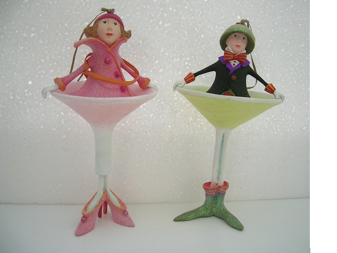 Krinkles Cosmopolitan Mädchen Ornament aus Resin 18 cm zum Hängen. Die Frauen Figur trägt rosa farbige Mütze, Mantel, Schal, High Heels (Stöckelschuhe) und weisse Handschuhe. Der Glasstil sind die Beine. Das Oberteil des Krinkles Mädchens steht in einem Cosmopolitan Cocktail Glas. Zur selben Serie passend gibt es noch Krinkles Madamme Champagner, Oliver Martini, Marguerite Margarita Mädchen, Peter Colada Junge. Alle Figuren sind handgemacht und von der Kinderbuchautorin Patience Brewster entworfen.Ab 2014 kommen noch der dunkelroter Rotwein Junge und das Krinkles Petal Rose Wein Mädchen dazu