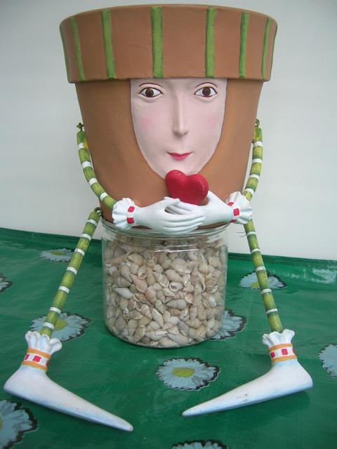 Krinkles Blumentopf Frauengesicht. Beine sind zum Anhängen. Höhe: 18 cm, (nur der Topf) Durchmesser: 15 cm Material Resin und Keramik. Die Frau hält in ihren Händen ein rotes Herz. Dieser Blumentopf ist auch für das Krinkles Maxischwein zum Aufsitzen geei