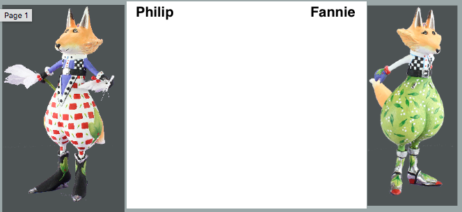 Fannie & Philip Fuchs Krinkles Patience Brewster handgearbeitete Figuren, aufwändig bemalt aus Resin, 15,5 cm hoch. Philip Fuchs trägt eine weissrot karrierte Reiterhose, Fannie trägt eine grüne Reiterhose mit Blattmuster. Jede Figur ist mit PB gestempelt.