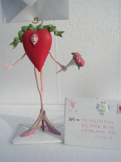 Valentine Herz Krinkles auf High Heels (Stöckelschuhe) mit Rosenstrauss in der Hand + grünem Band oben für Bilder, Liebesbriefe, Visitenkarten, Notizen etc. H: 16 cm. Die Unterseite des Krinkles Fotohalters ist als Liebesbrief gestaltet. Siehe rechter Bilderausschnitt. Diese Krinkles Frauenfigur ist ein bezauberndes Valentines Tag Geschenk.