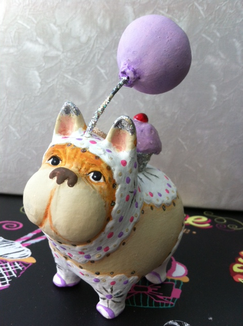 Die französische Bulldogge Cupcake ist Frankies Bruder aber in beige. Er trägt auch eine Spitzenschürze mit bunten Punkten und hat auf dem Rücken einen fliederfarbigen Cupcake. Auf dem Kopf für die Party einen fliederfarbigen Luftballon. Höhe 11,5 cm. Material Resin.