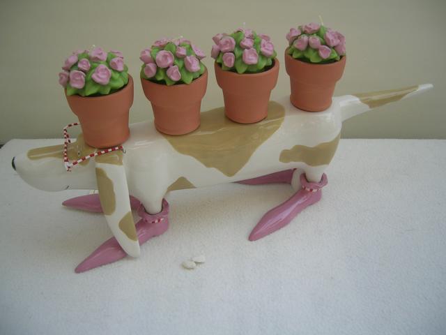 Krinkles Hund Basset- Kerzenständer mit 4 Blumenkerzen im Tontopf. Der Kerzenständer ist aus Keramik. 40x18 cm. Der Hund Basset trägt rosa Pumps und eine rotweisse Brille. Zum Hund gibt es Ersatzkerzen. Eine schöne Alternative zu Gloria dem Alligator Kerzenständ
