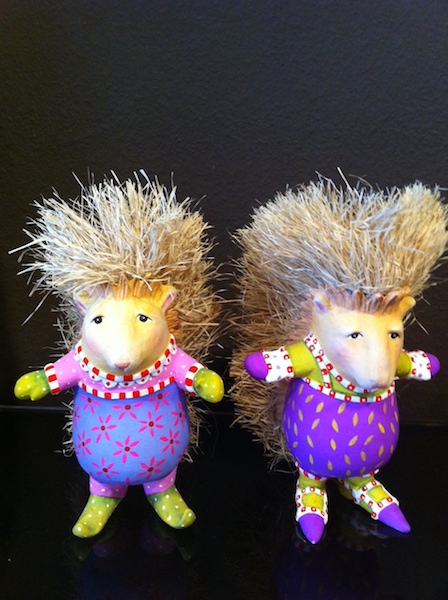 Igel Porkie und Piney Porcupine aus Resin sind 13 cm groß. Das Stachelkleid ist aus Hanfborsten täuschend echt den Igelstacheln nachempfunden. Piney trägt Blumenhose lilarosa und grüne Schuhe. Porkie trägt Blätterornament auf lila Hose und grünlila Schuhe. Der Preis gilt pro Stück.