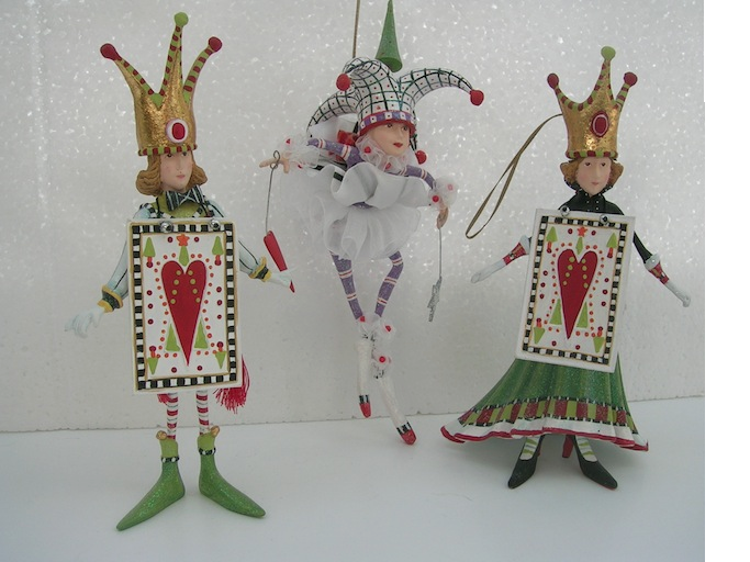 Die Kronen sind mit Blattgold überzogen. Um den Hals tragen der Krinkles König und die Königin Spielkartenfiguren eine Herz Ass Spielkarte. Farben: grün, rot, weiss, Blattgold. Jack und Jackqueline als Set für 142,00€