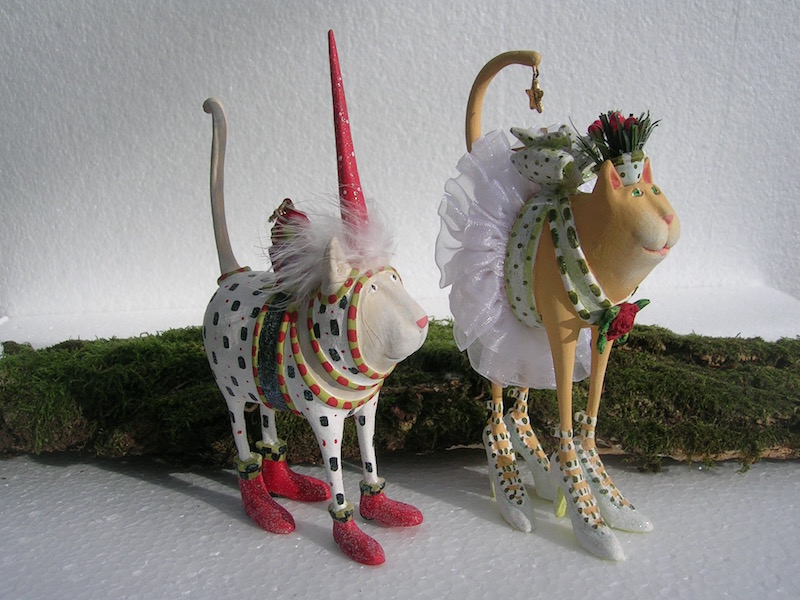 Pat Santa Hat Katze (ausverkauft) von Krinkles mit roten Stiefeln, rotem Spitzhut, grüner Schleife und Geschenkpaket auf dem Rücken. Der Anzug ist weiss und hat grüne Vierecke. Der Preis gilt pro Stück. Höhe 9 cm