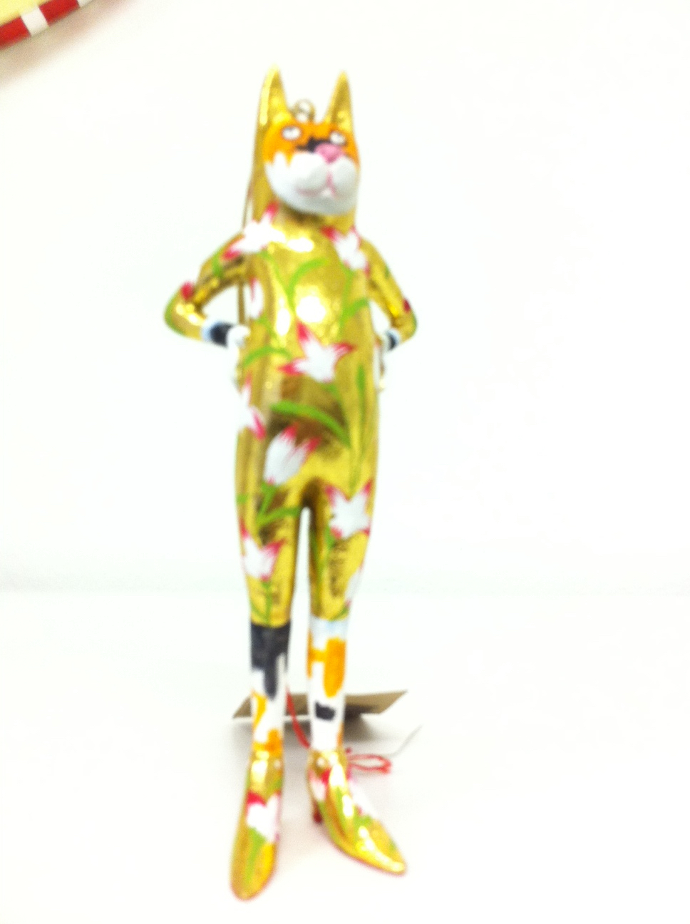 Candy Calico ist eine dreifarbige Katze und präsentiert sich im goldenen Catssuit mit Lilienmuster. Sie trägt dazu passende Pumps. Material Resin von Patience Brewster. Höhe 15,5 cm