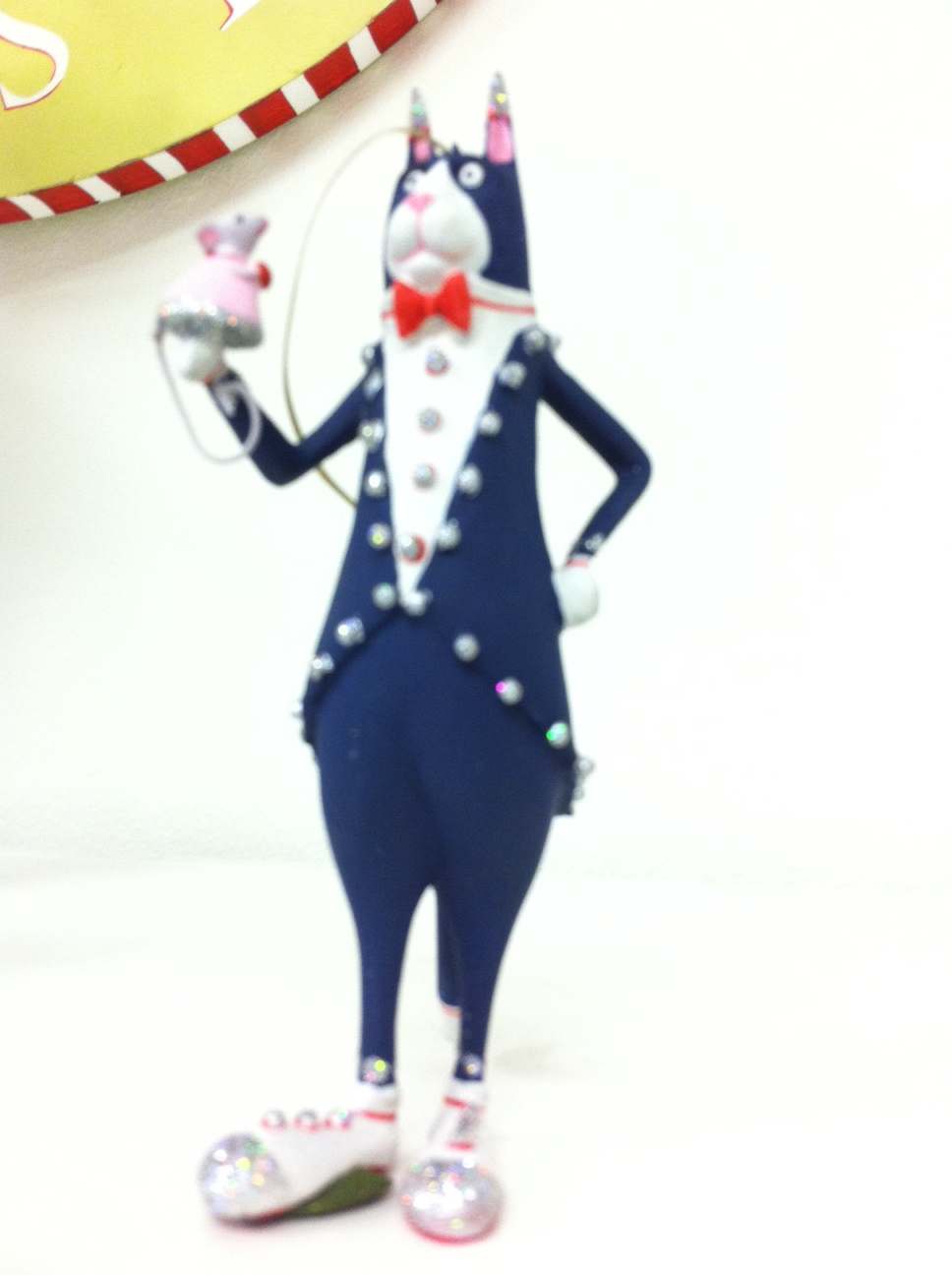 Katze Thomas Tuxedo Ornament Krinkles von Patience Brewster. Material Resin. Die Katze trägt einen dunkelblauen Frack mit silbernen Perlen besetzt, ein weißes Smokinghemd mit roter Fliege und weiße Schuhe mit Glitzerbesatz. Mit der rechten Pfote präsentiert er seine neuste Errungenschaft, die graue Maus in rosa Kleidchen. Höhe 15 cm.