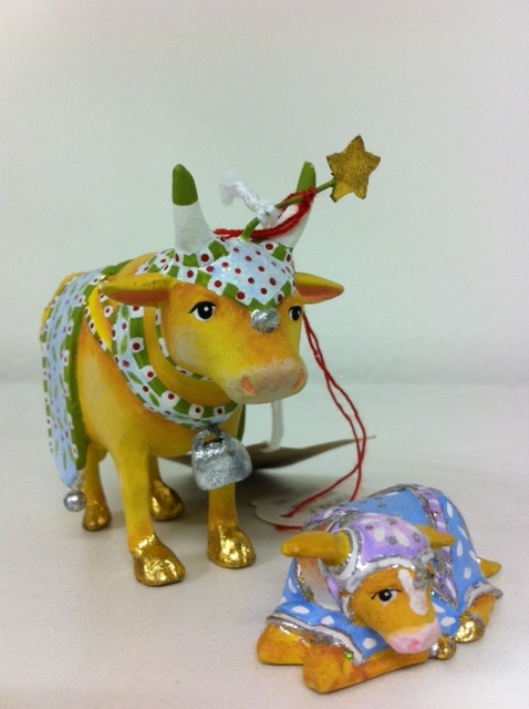Beschreibung Krippe Krinkles Minis Kuh und Kälbchen von Patience Brewster. Die Kuh ist 9 cm groß, aus Resin und sieht genauso aus wie die Mangerkuh in der mittleren Größe auf unserer Seite. Das kleine Kälbchen ist 2,4 cm groß, liegend und ist mit einer blauen Decke bedeckt.Teils blattvergoldet. Material Resin.
