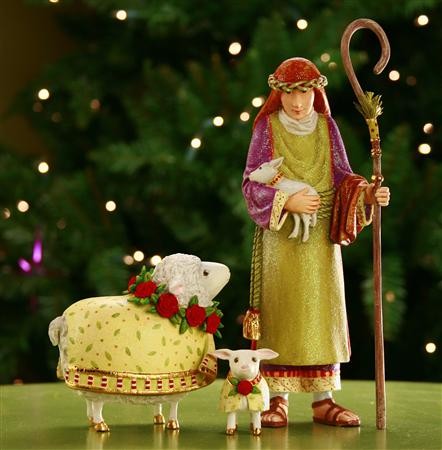 Krinkles Krippenfiguren "Nativity Set". Hier der männliche Hirte mit Schaf und Lamm aus Resin, passend zur Krinkles Krippe. Größe Hirte 21,6 cm, Lamm 11,4 cm, Lämmchen 5 cm. Der Krinkles Hirte trägt ein kleines Lamm auf dem Arm und hält seinen gebogenen H