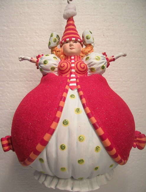 Lebkuchen Mutter Ginger Mother Krinkles Figur zum Hängen. Trägt roten Mantel und weiss/grün gepunktetes Kleid. Auf dem Kopf hat sie eine rot gestreifte Mütze mit Bommel. Figur aus Resin 20 cm groß.