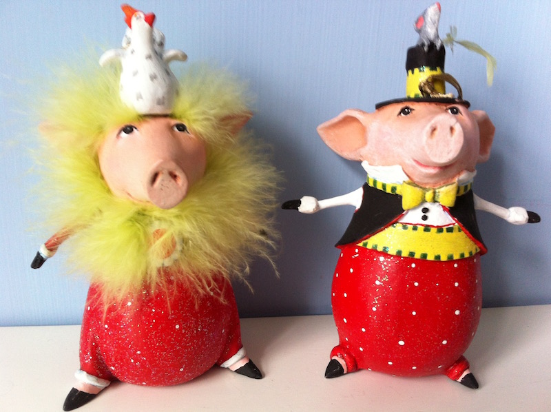 Pierre & Phyllis Pig Schweinefiguren von Krinkles 12,7 cm. Frau Phyllis trägt eine grüne Federboa, ein rotes Kleid. Als Hut trägt sie ein gepunktetes Huhn auf dem Kopf. Ehemann Pierre trägt einen schwarz/roten Frack. Auf dem Zylinder sitzt eine Maus. Wunderschöne Krinkles Figuren der Krinkles Designerin Patience Brewster.