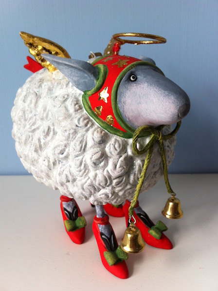 Beschreibung Blanche das Schaf von Krinkles in weiss mit roter Mütze und weissen Sternchen, roten Pumps mit grüner Schleife als LLS Ornament der Leukämiestiftung für Gregg Holland. Blanche ist aus Resin 12.7 cm gross und trägt einen goldenen Heiligenschein sowie silberne Flügel.