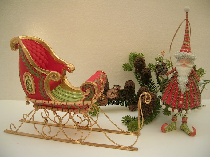 Endlich bekommt der Weihnachtsmann Santa Claus den passenden Krinkles Schlitten für seine Rentiere aus Resin und Metall in rot grün mit Blattgoldauflage. Nun kann er mit seinem Krinkles Schlitten durch den Schnee flitzen.