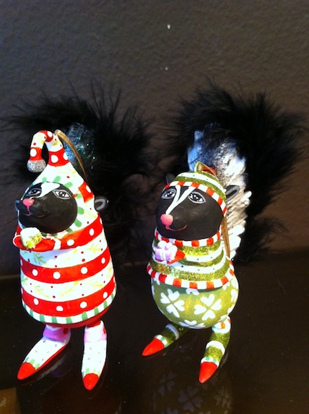 Beschreibung Die niedlichen Stinktier Minfigur Sniffy und Sal Krinkles sind 9 cm groß und aus Resin. Sal hat ein rotweiss gestreiftes Kleidchen und hält eine grüne Tasse in der Hand. Sniffy hat ein grünen Blumendress und präsentiert ein lila Geschenkpaket. Der Schweif besteht aus Federn. Der Preis gilt pro Stück.