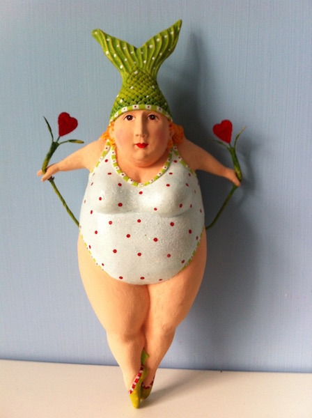 Krinkles Synchron Schwimmerin aus Resin ist 19 cm gross und zum Hängen. Sie liebt das Meer. Sie verbreitet ihre fröhliche Gesinnung wo immer sie auch ist. in ihrem Glitzer weissen Anzug mit roten Punkten. die Badekappe stellt einen Fischschwanz dar. Links und rechts trägt sie ein Herz in den Händen.