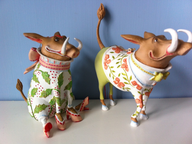 Winifred und Walter Warzenschwein von Krinkles aus der Jambo Kollektion - Resin. Der Preis gilt pro Stück. Winifred 10.8 cm trägt weisse Pumps mit roter Sohle und ein weisses Kleid mit Ilex Muster mit Kragen. Walter 13,9 cm mit seinen weissen Stosszähnen hat einen hellblauen Kragen mit grüner Schleife.