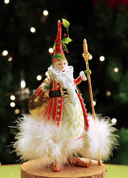 Krinkles Santa rot, 18 cm, Nicholas das Exclusivmodel mit Blattgold und Fellbesatz am roten Mantel. Er trägt einen goldenen Kerzenhalter in der Hand. Krinkles Nicholas Santa eignet sich für die Elch Gruppe 17-20 cm (mittlere Größe). Figur ist auch zum Hän