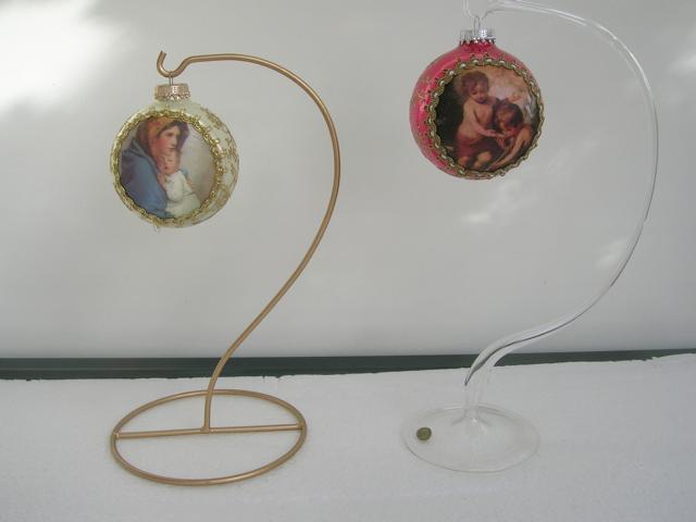 Aufhänger zum Stellen für Christbaumkugeln und Christbaumschmuck aus Lauscha Thüringen in Glas oder Metall. Glasaufsteller (Hänger) Höhe 30 cm für Kugeln bis 18 cm Durchmesser 13,-€, Metallaufsteller (Hänger) Höhe 27 cm für Kugeln bis 18 cm 5.95, €- Durch