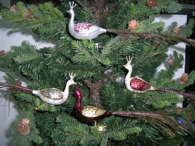 Aus kleiner Glasgläsermanufaktur in Lauscha hergestellter Pfau, verschiedene Farben, Gesamtlänge 33 cm (Schwanz 24 cm) Farben: Champagner/rot, Champagner/silber und rot/gold. Der Schwanz besteht aus echten (natürlich abgeworfenen) Pfauenfedern.