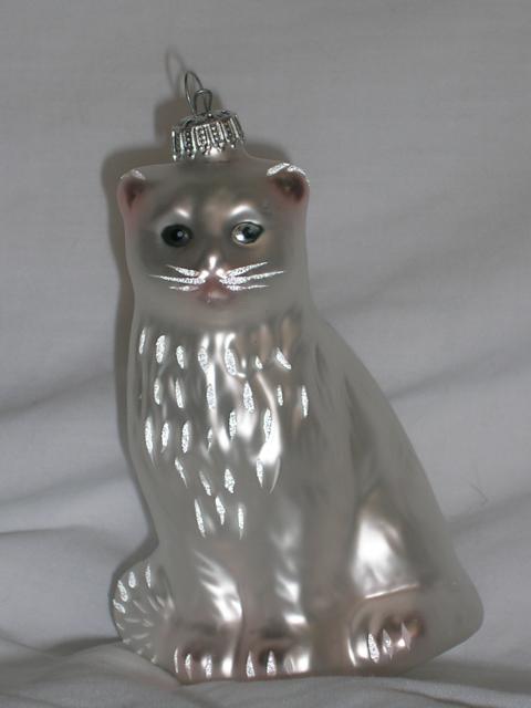 Glas Christbaumschmuck aus Lauscha, 11,5 cm, deutsche Handarbeit aus Thüringen, Katze Farbe perlmutt silber