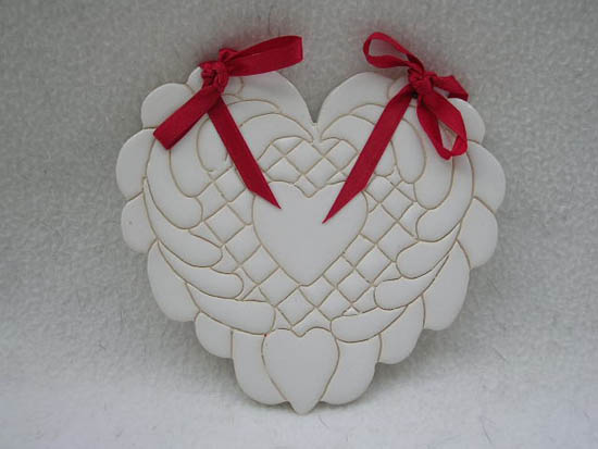 Herz aus Keramik, Handarbeit aus Dänemark, Farbe weiß mit roter Schleifchenaufhängung.
