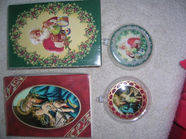Grusskartenbox 12x16x3 mit Thüringer Glastaler - Motiv Santa aus Lauscha in der Farbe grün, Motiv Maria mit Jesus Kind Farbe rot. Mit 5-sprachigen Innentext - Frohe Weihnachten. (D, GB,USA,F,I,SP)