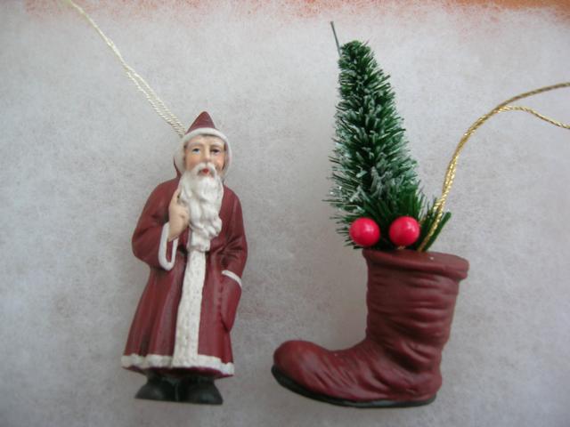 Papiermache Baumbehang Stiefelchen + Baum + Weihnachtsmann antik